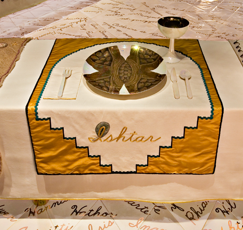 I believe that Judy Chicago created the piece in this way because our entire past, including the Bible, is so focused on men – its history – but with this creation, it’s now her story; women, not men, are the main focus. The table is set up for “a panoply of the greatest female figures, mythological, historical, fictional – all of whom were crucified by the face of their sex;” they too are important, legendary, and knowledgeable says Gail Levin in her 2007 biography of Judy Chicago. The art represents women and has been created by women; the entire display promotes sisterhood and unity with its triangular table where everyone is equal and no one woman is more prominent than any other. In other words, the exhibit is genius.
